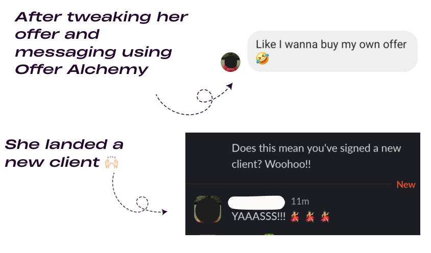 You create your no-brainer offer with our proprietary framework- Offer Alchemy. This process has landed corporate clients, multi-five figure deals, sell out coaching launches, and more importantly- really happy coaching clients who want to stay with you (forever!)Â